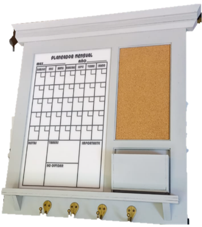 Tablero de cocina, planificador, portallaves, tarjetero, recordatorios. Materiales: madera y fibra media densidad. 40 x 65 cms